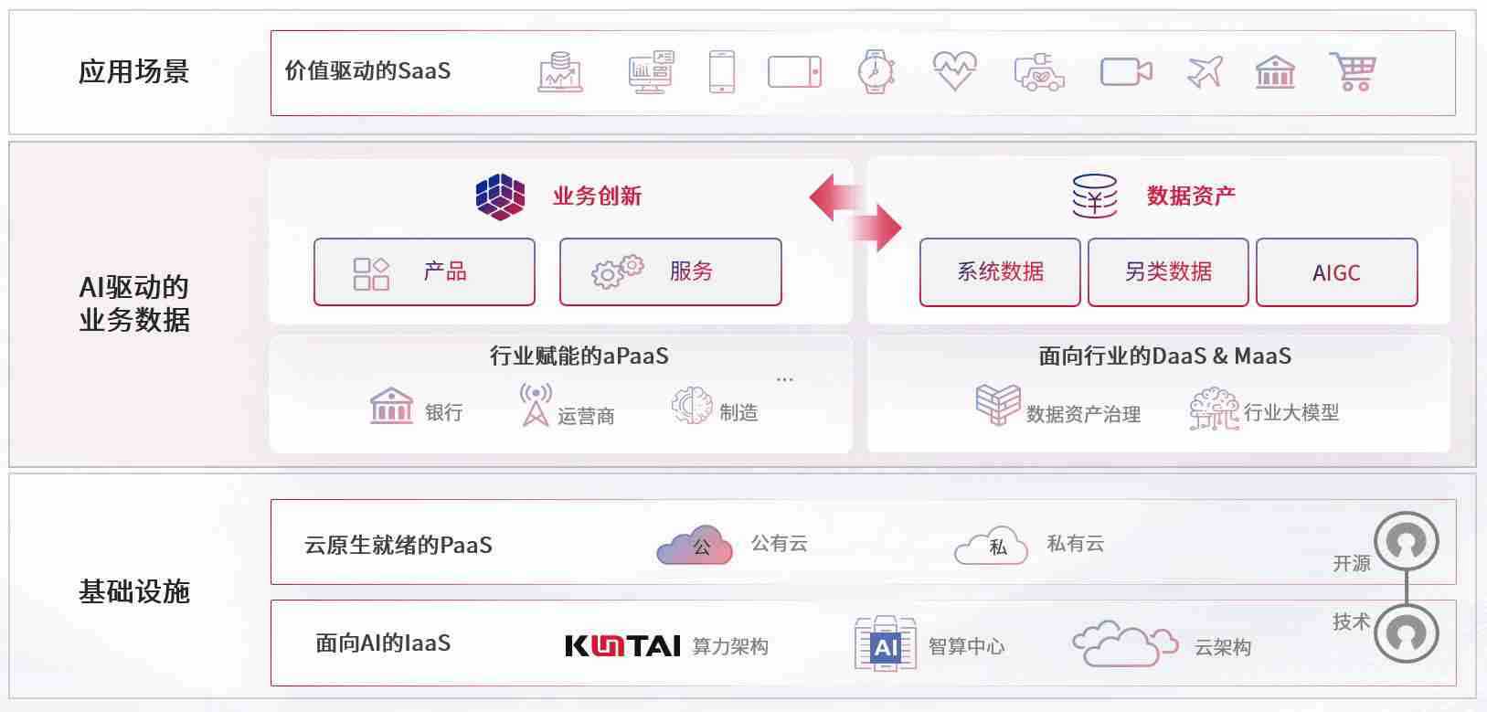 数字时代,,,,围绕企业数字化转型的关键要素,,,壹号娱乐数码开创性的提出数云融合战略和技术体系框架,,,着力在云原生、、数字原生、、、AI原生和信创产业上架构产品和服务能力,,,为处在不同数字化转型阶段的快消零售、、、汽车、、金融、、、医疗、、、、政企、、、教育、、、、运营商等行业客户提供泛在的敏捷IT能力和融合的数据驱动能力,,构建跨界融合创新的数字业务场景和新业务模式,,,,助力企业级客户建立面向未来的核心能力和竞争优势,,,,全面推动社会的数字化、、、、智能化转型升级。。。。